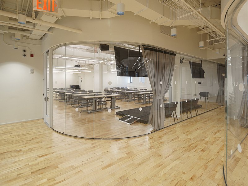 - * The Idea Lab — Meeting room set classroom style for 60 people; includes a stage with 4 mics and 3 screens.