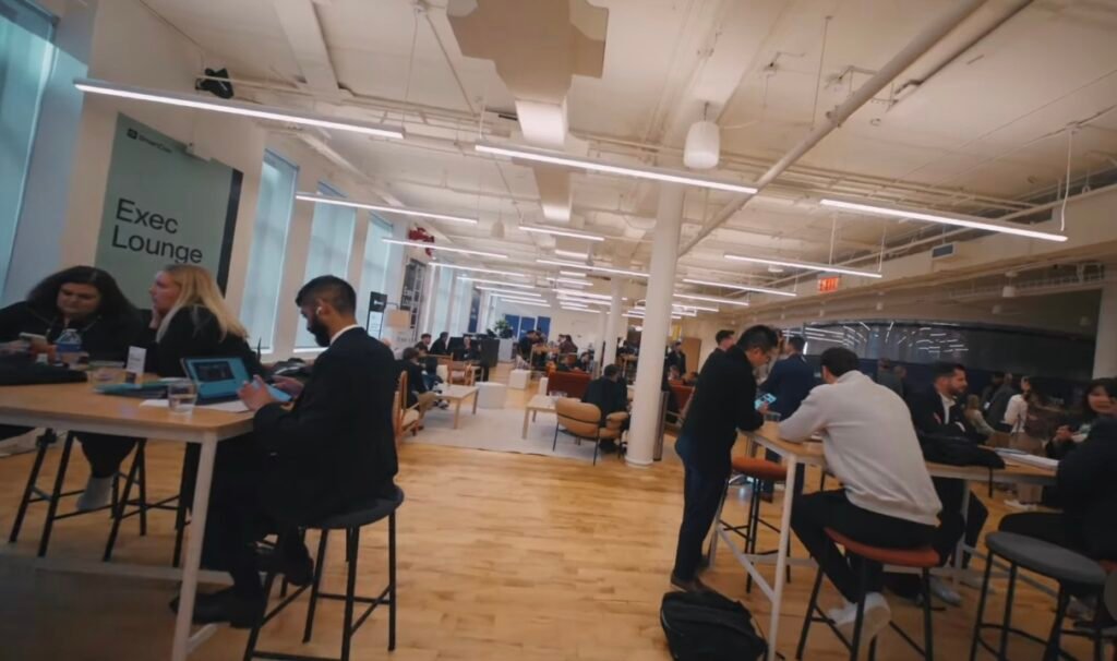 - * South Lounge — Common space with a comfortable, modern aesthetic, natural light, lounge furniture, tables, a state-of the art kitchen area, and private ROOM pods.