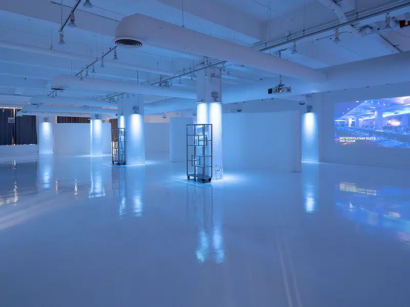 The Gallery provides a light, adaptable aesthetic with a seamless high-gloss floor gleaming day and night. This space features a catering prep area, green room, built-in coat check area, a 1,500 sq ft interior breakout room, and access to a 3-bay all-weather loading dock.